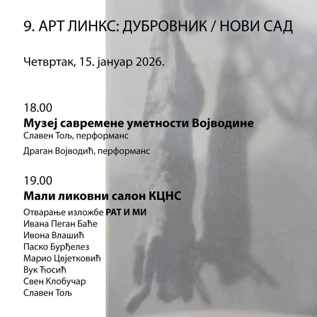 U četvrtak, 15. januara u 19.00 časova u Malom likovnom salonu KCNS u Novom Sadu, otvara se izložba RAT I MI, na kojoj učestvuju dubrovački umetnici: Ivana Pegan, Ivona Vlašić, Pasko Burđelez, Mario Cvjetković, Vuk Ćosić, Sven Klobučar i Slaven Tolj. Sat vremena ranije, u 18.00 časova u Muzeju savremene umetnosti Vojvodine, u okviru pratećeg programa izložbe InterMediaArt, kustoskinje Sanje Kojić Mladenov, performanse izvode dubrovački umetnik Slaven Tolj (Novi Sad – Branko Milinov) i novodsadski umetnik Dragan Vojvodić (Biografija)