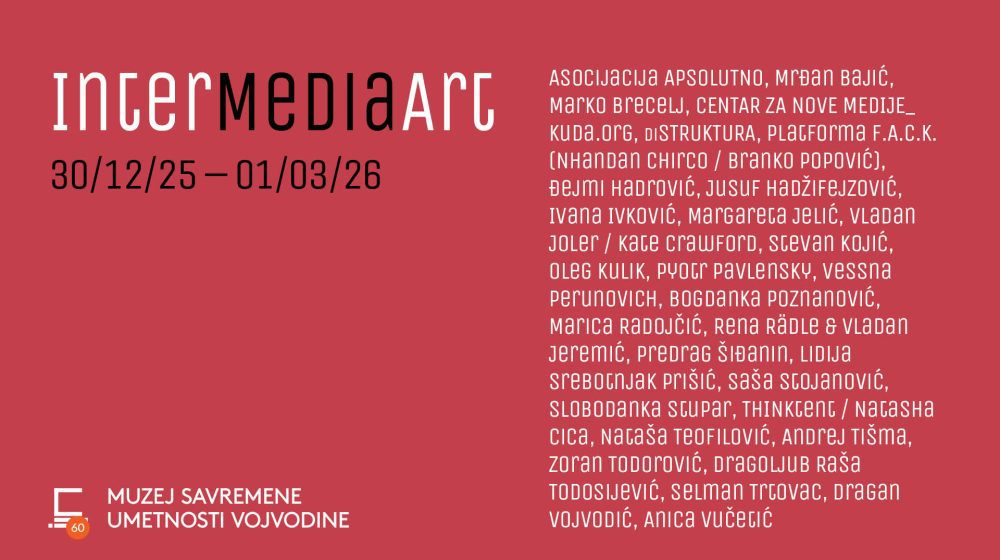Od 30. decembra 2025. godine u Muzeju savremene umetnosti Vojvodine u Novom Sadu može se pogledati izložba „InterMediaArt – intermedijska i digitalna umetnost“. Kustoskinja izložbe, koja će biti otvorena do 1. marta 2026. godine, jeste dr Sanja Kojić Mladenov, muzejska savetnica MSUV, a ovom izložbom nastavlja se novi ciklus prezentacije muzejske kolekcije, realizovan povodom obeležavanja 60 godina postojanja Muzeja savremene umetnosti Vojvodine.